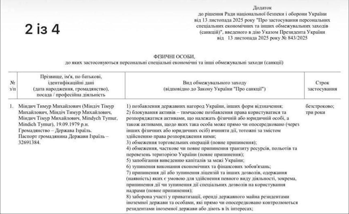 Mindič Timur Mychajlovyč (Міндіч Тимур Михайлович, Mindych Tymur, Mindich Tymur), nar. 19. 9. 1979, státní příslušnost Stát Izrael, pas Izraele č. 32691384.