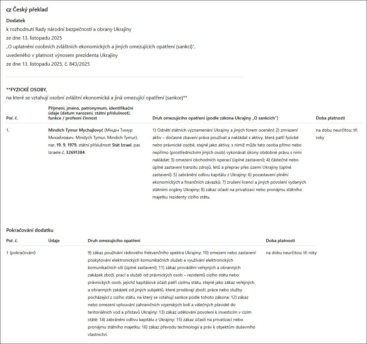 A to znamená, že oba mohou nadále jezdit na Ukrajinu, mohou na Ukrajině podnikat, pakliže veškeré tyto činnosti budou provádět jako občané Ukrajiny a nikoliv jako občané Izraele. Sankce ano, ale jen vocuď pocuď. Není divu, že tyto sankce vyvolaly mezi poslanci Nejvyšší rady v Kyjevě posměch a dokonce pozdvižení. Mindič podle posledních informací uprchl právě do Izraele, kam odletěl z Varšavy poté, co 10. listopadu uprchl z Ukrajiny ve vrtulníku Zelenského prezidentské letky. Níže je přepis sankčního listu.