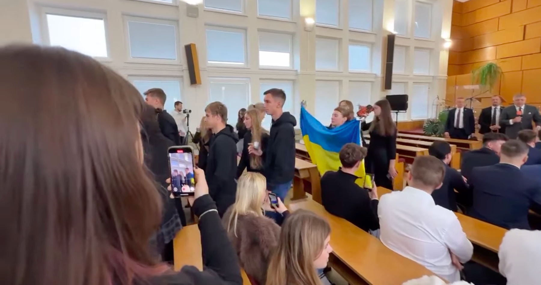 V reakcii na to sa skupinka stredoškolákov oblečených do čiernych tričiek postavila a štrngajúc kľúčmi opustila miestnosť zasadačky okresného úradu. Jeden z nich držal ukrajinskú zástavu.