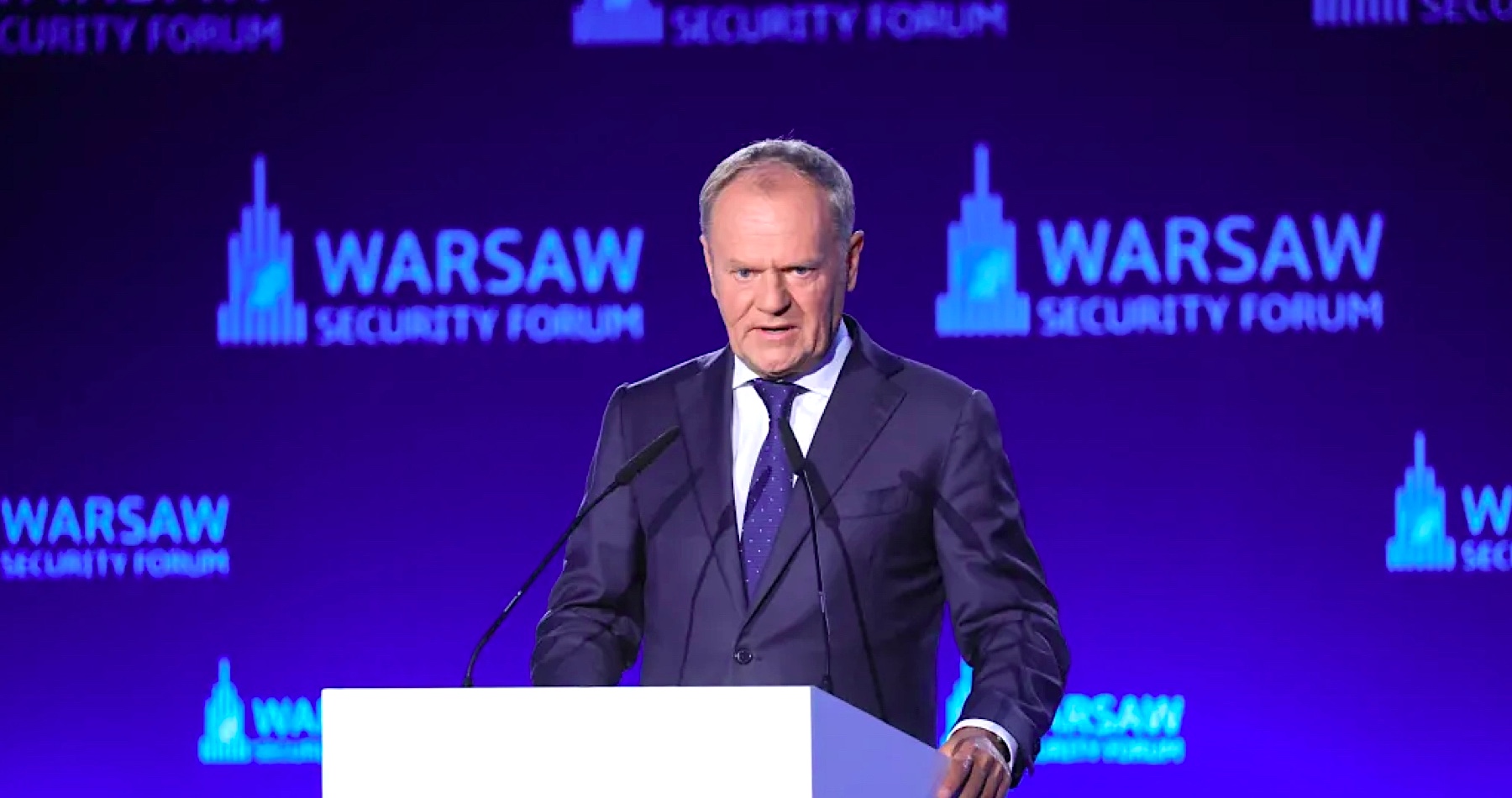 „Či sa to niekomu páči alebo nie, je to naša vojna nielen kvôli solidarite s tými, ktorí sú pod útokom, ale aj kvôli našim základným záujmom. Ak túto vojnu prehráme, následky ovplyvnia nielen našu generáciu, ale aj budúce generácie. V Poľsku, v celej Európe, v Spojených štátoch, všade na svete,“ uviedol Tusk a dodal, že Ukrajina platí vysokú cenu, a predsa nekapituluje. „Ukrajina sa nevzdáva, Ukrajina bojuje, a nielen my dnes vo Varšave, nielen Ukrajinci v Kyjeve, ale aj prezident Trump nedávno, na prekvapenie mnohých, verejne povedal, že Ukrajina môže vyhrať túto vojnu. Tieto slová majú veľký význam, a táto viera má veľký význam, pretože prehra alebo výhra je v mysliach a srdciach, až potom na bojovom poli… Ak Ukrajina dokáže bojovať hrdinsky, aj veľmi racionálne, veľmi pragmaticky, tak prečo by celá Európa alebo celá transatlantická komunita mala mať nejaký komplex tvárou v tvár agresorovi? Keby sme čo i len na chvíľu pomysleli, že my, Západ, musíme túto vojnu prehrať, bolo by to neodpustiteľné“.