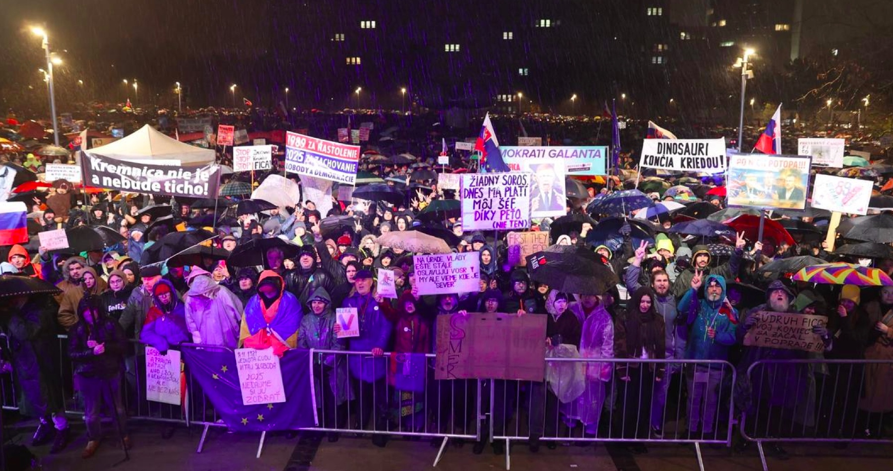 Na proteste v centre Bratislavy vyzvali opozičné strany a hnutia KDH, SaS, PS a mimoparlamentná strana Demokrati na koniec vlády premiéra Roberta Fica (Smer-SD). Chcú ho poraziť v najbližších voľbách. Líder PS Michal Šimečka vyjadril ambíciu vyhrať ich.