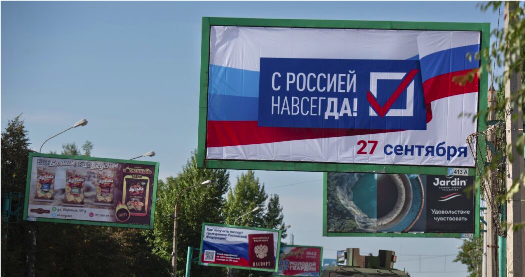 V okupovaných častiach Chersonskej oblasti otázka znie: "Ste za odtrhnutie Chersonskej oblasti od štátu Ukrajina, vytvorenie samostatného štátu z Chersonskej oblasti a jeho pripojenie k Ruskej federácii, ako subjektu Ruskej federácie?" Marina Zacharovová, členka tamojšej volebnej komisie, odhaduje účasť na 750.000 voličov.