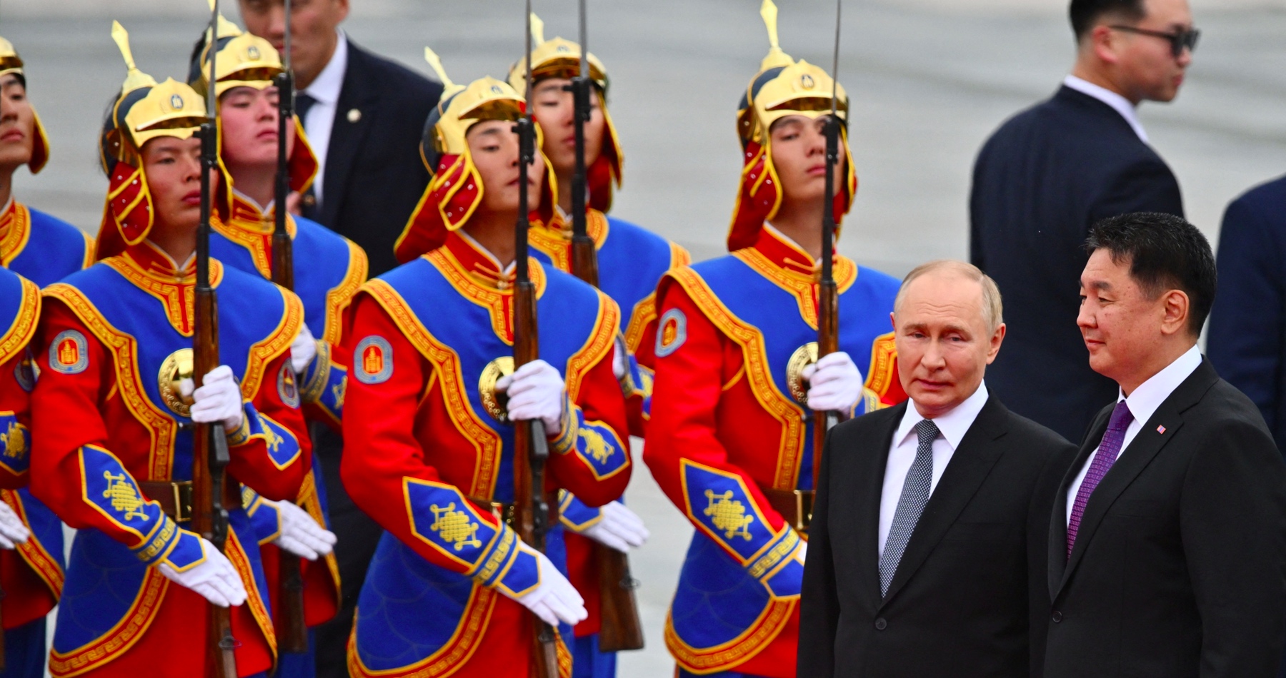 Chürelsüchv utorok ráno privítal ruského lídra pred štátnym palácom na hlavnom námestí Ulánbátaru. Súčasťou ceremónie bola čestná stráž a oddiel jazdcov oblečených ako stredoveká mongolská kavaléria. Zazneli hymny oboch národov, pričom Putin prijal aj kyticu červených ruží od malého dievčatka.