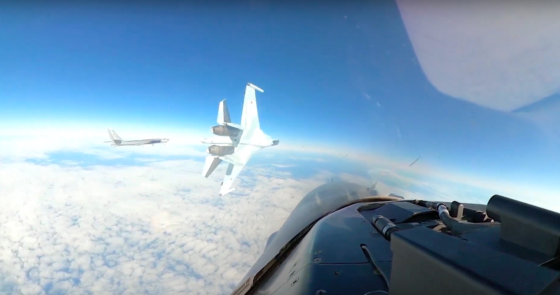 VIDEO: Ruská stíhačka SU-35 pri americkom pobreží na výstrahu tesne zozadu preletela okolo prekvapenej posádky amerického stíhacieho lietadla F-16, ktorá z blízka pozorovala ruský strategický bombardér TU-95 letiaci v medzinárodnom vzdušnom priestore