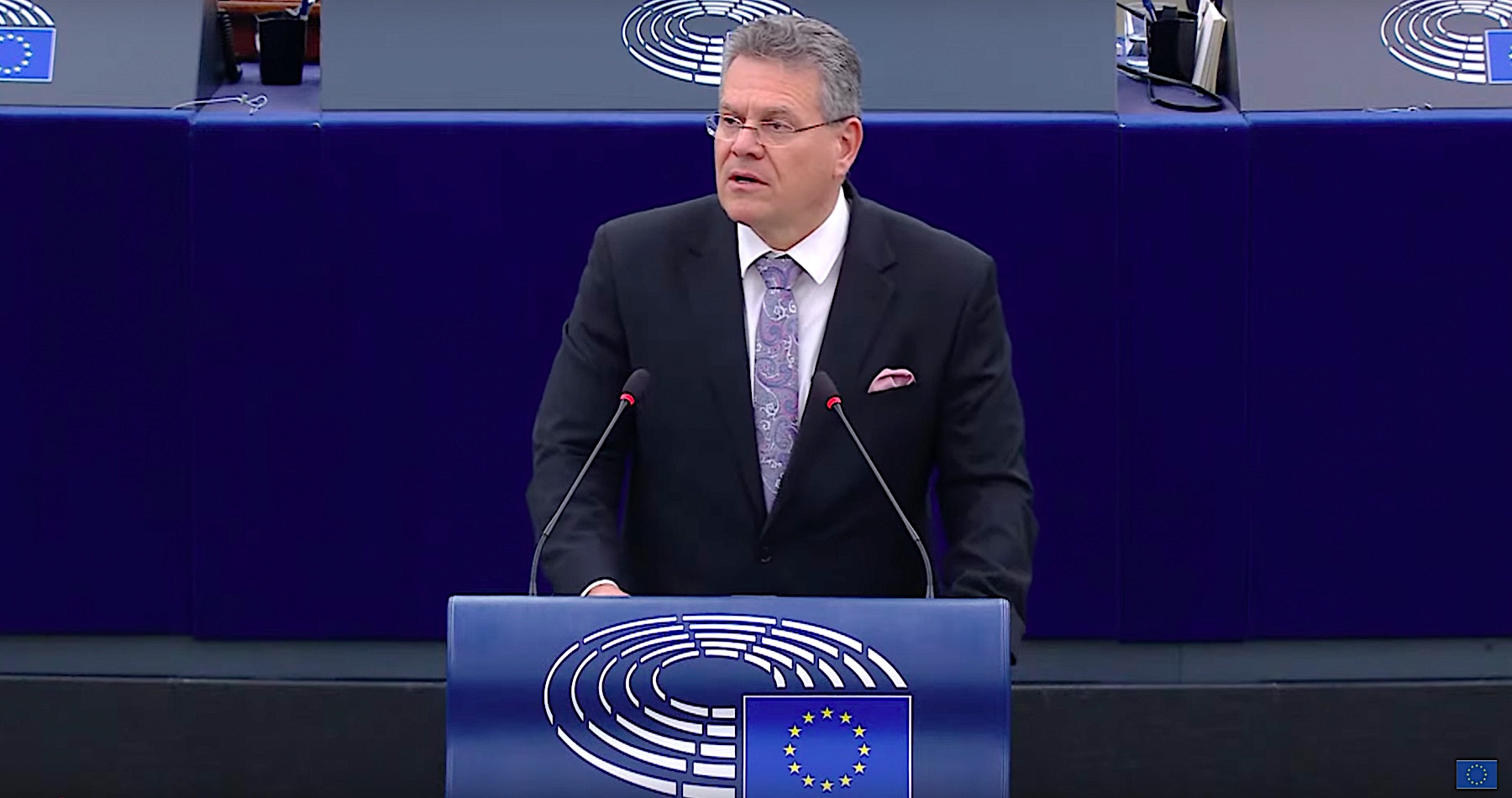 Šefčovič prejav v angličtine na začiatku videa: