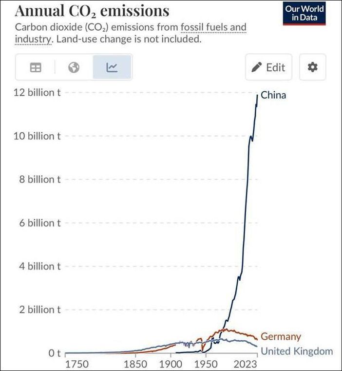 Ten zachycuje úrovně vypouštěných emisí Německa, Velké Británie a Číny, kde je vidět, že snižování emisí v EU, které je nepatrné, nemá na ochranu klimatu prakticky žádný dopad, zatímco Čína, která se na Kjótském protokolu nepodílí, vypouští obrovská kvanta CO2 bez jakéhokoliv omezení.
