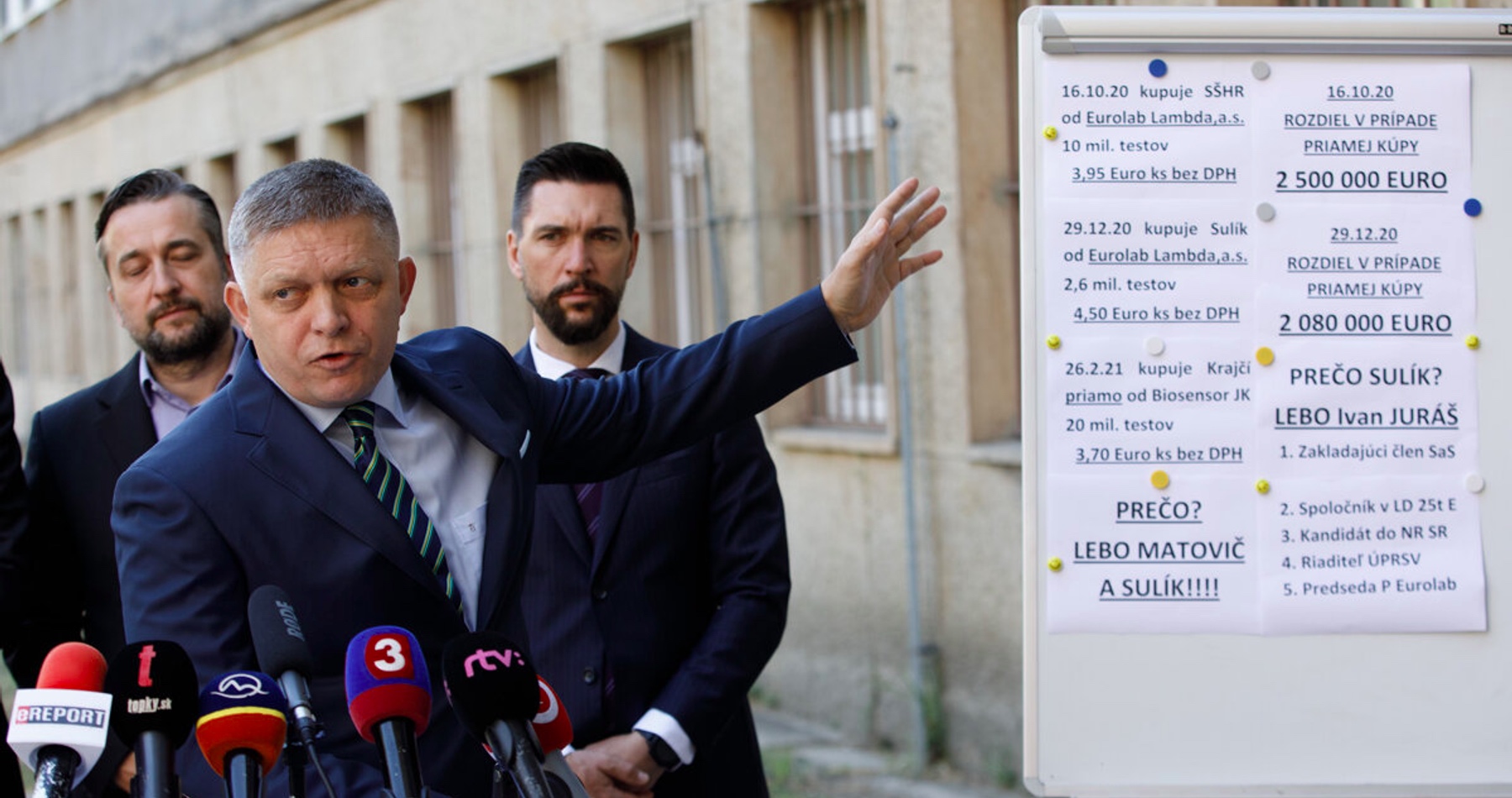 "Podávame verejné trestné oznámenie a žiadame NAKA, keď je taká aktívna pri vykopávaní dverí, keď je taká aktívna pri krivom obviňovaní ľudí, nech sa tomuto lupu Matoviča, Sulíka a Krajčoviča (riaditeľ trnavskej firmy Eurolab Lambda Peter Krajčovič, pozn. TASR) venujú. Pretože vo všetkých prípadoch predtým, keď sa kupovali testy, to mohli urobiť napriamo od juhokórejskej firmy Biosenzor, ale neurobili to, lebo potrebovali zarobiť," uviedol Fico.