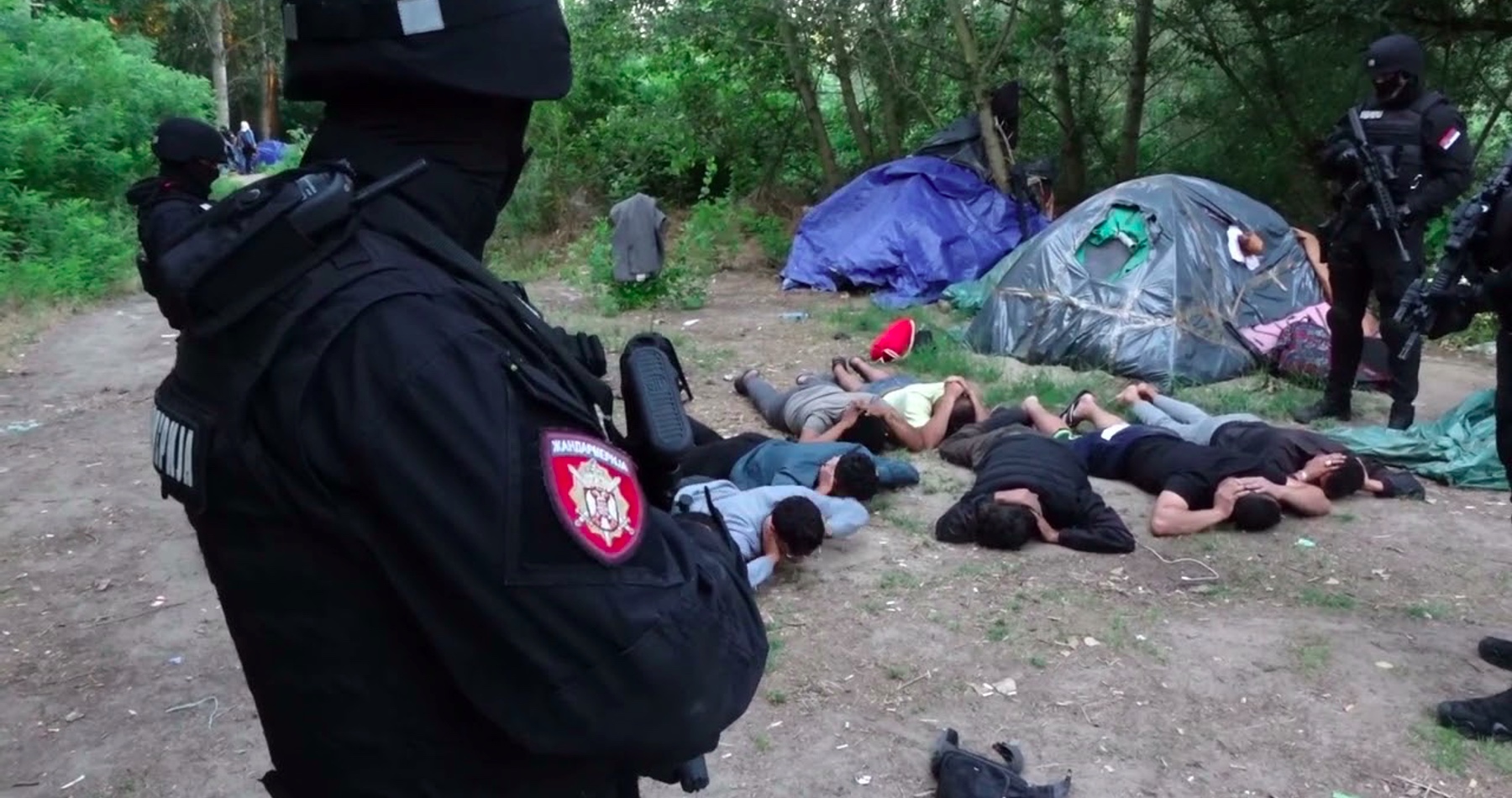 Na policajnom videu z miesta činu vidno niekoľko ľudí tvárou k zemi a s rukami za hlavou, keď špeciálna jednotka prehľadávala stany a drevené chatrče. Na záberoch vidno zhabané mobilné telefóny a nože.