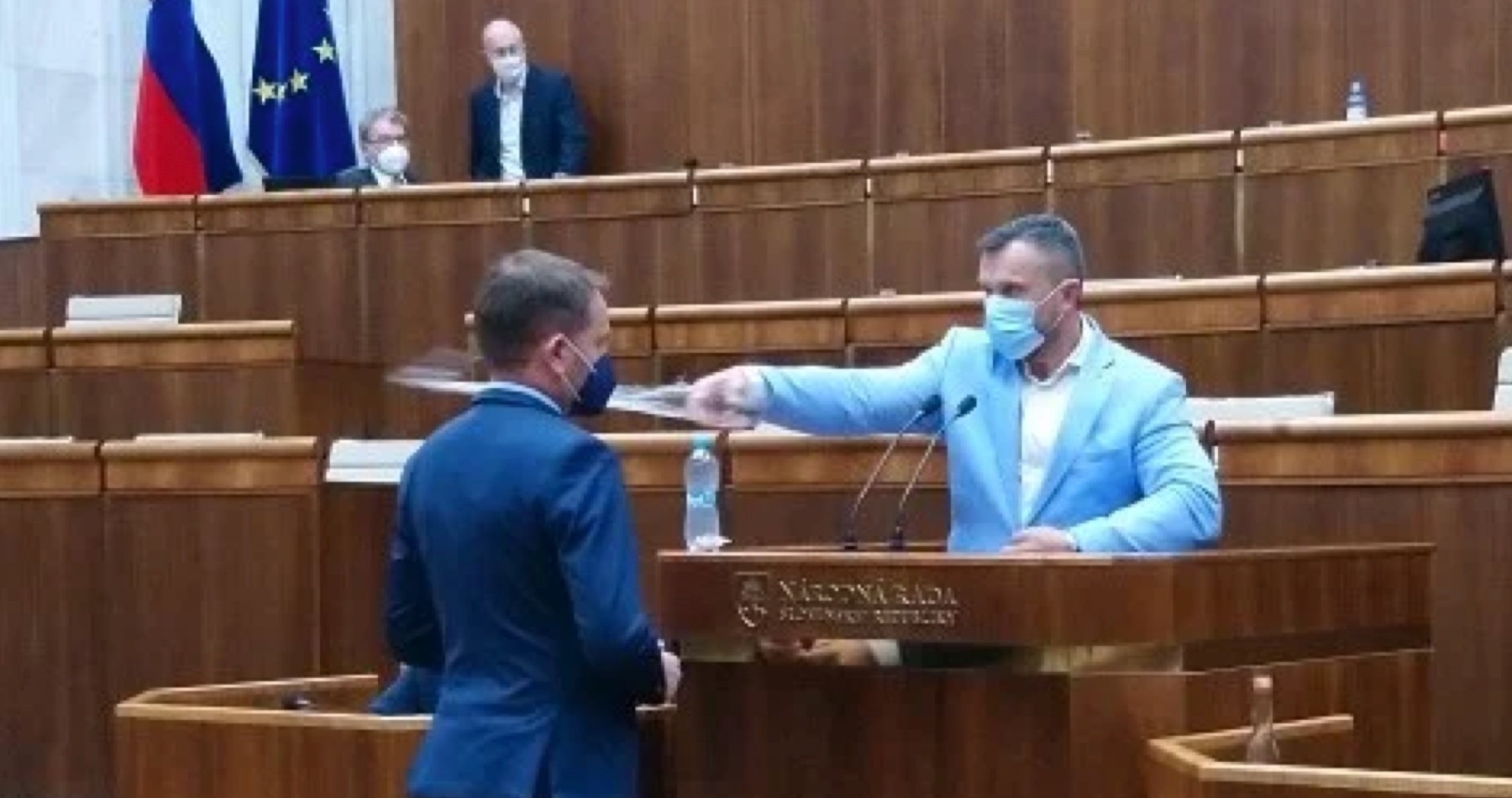 Odídenec z ĽSNS Miroslav Suja oblial s pohárom vody ministra financií Igora Matoviča.