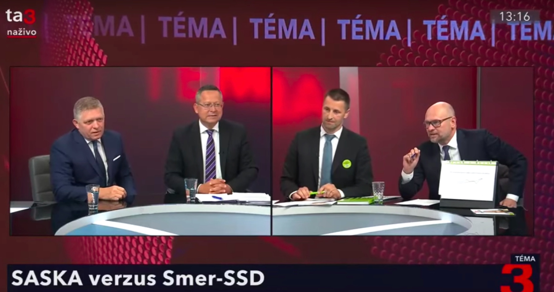 Do televíznej debaty Téma na TA3 prišli dňa 31. augusta 2023 za stranu Smer diskutovať Robert Fico & Ladislav Kamenický a za SASKU Richard Sulík & Marián Viskupič.