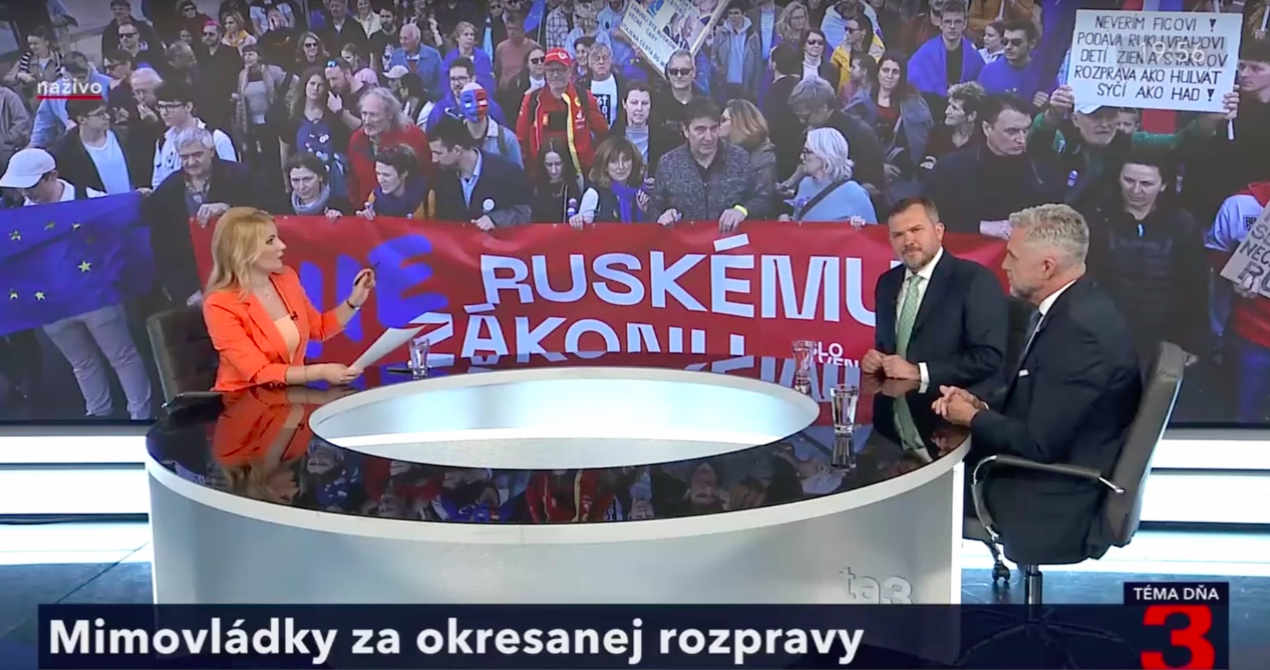 Vo svojom vyjadrení na sociálnych sieťach upozornil na „nenápadný“ baner v pozadí štúdia, kde boli zobrazení protestujúci občania s nápismi ako „Nie ruskému zákonu“ či označeniami premiéra ako „mafiánskeho diktátora“.