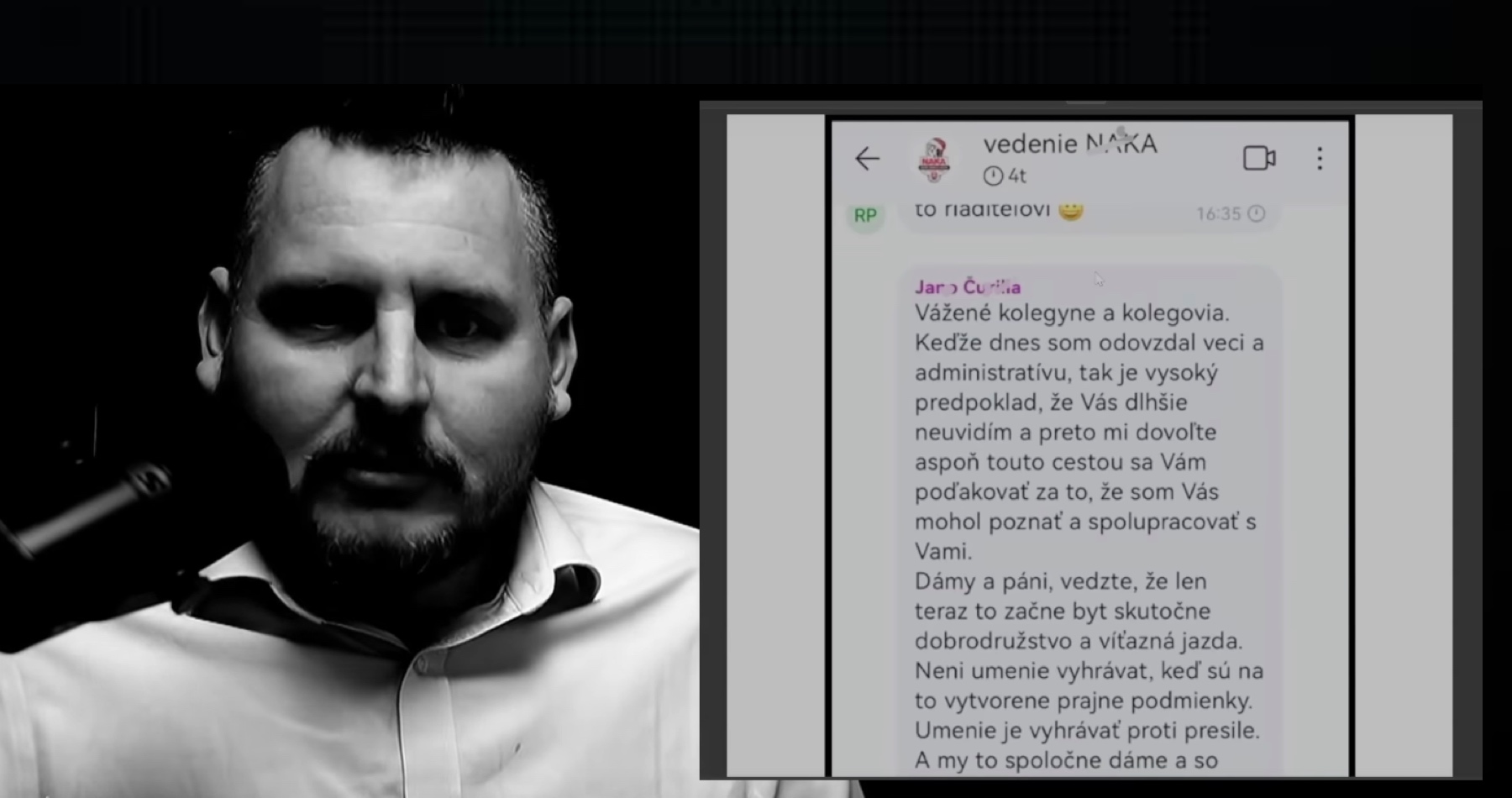 Celá konverzácia, z ktorej má správa pochádzať, nesie názov „vedenie NAKA.“ „Vážené kolegyne a kolegovia, keďže dnes som odovzdal veci a administratívu, tak je vysoký predpoklad, že Vás dlhšie neuvidím a preto mi dovoľte aspoň touto cestou sa Vám poďakovať za to, že som Vás mohol spoznať a spolupracovať s nimi,“ píše sa v správe, autorom ktorej má byť „Jano Čurilla.“