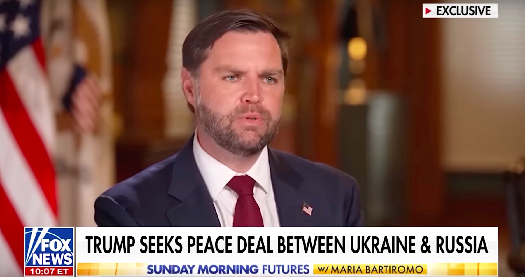 Vance tvrdil, že Trump presvedčil Putina, aby stiahol svoje odmietnutie stretnúť sa so Zelenským, a že sa teraz rokuje o naplánovaní rozhovorov medzi týmito tromi lídrami. Na otázku, či by sa Putin a Zelenskyj mali stretnúť skôr, ako sa do toho zapojí Trump, Vance odpovedal: „V skutočnosti si nemyslím, že by to bolo až také produktívne.“ Tvrdil, že americký prezident musí byť ten, kto „spojí týchto dvoch“, aby dosiahol zmysluplný pokrok.