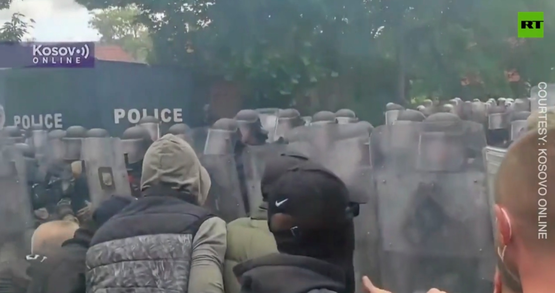 Reportér RT Balkan na mieste uviedol, že príslušníci vojenskej mierovej misie KFOR pod taktovkou NATO vyprovokovali zrážky tým, že vypálili prvý omračujúci granát, ale zo záberov to nie je hneď zrejmé.