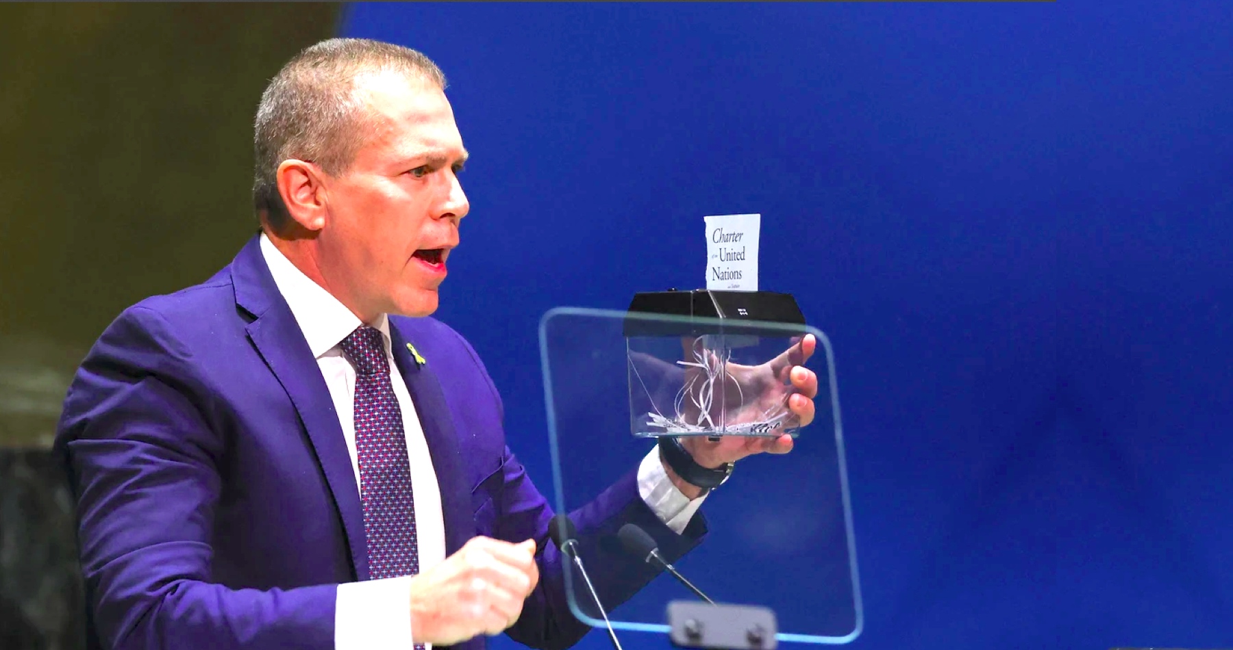Izraelský veľvyslanec pri OSN Gilad Erdan nahnevane vyhlásil, že OSN sa otvorila novodobým nacistom a genocídnym džihádistom a pri rečníckom pulte pred zrakmi diplomatov vzal skartovačku a zničil kópiu Charty Organizácie Spojených národov.