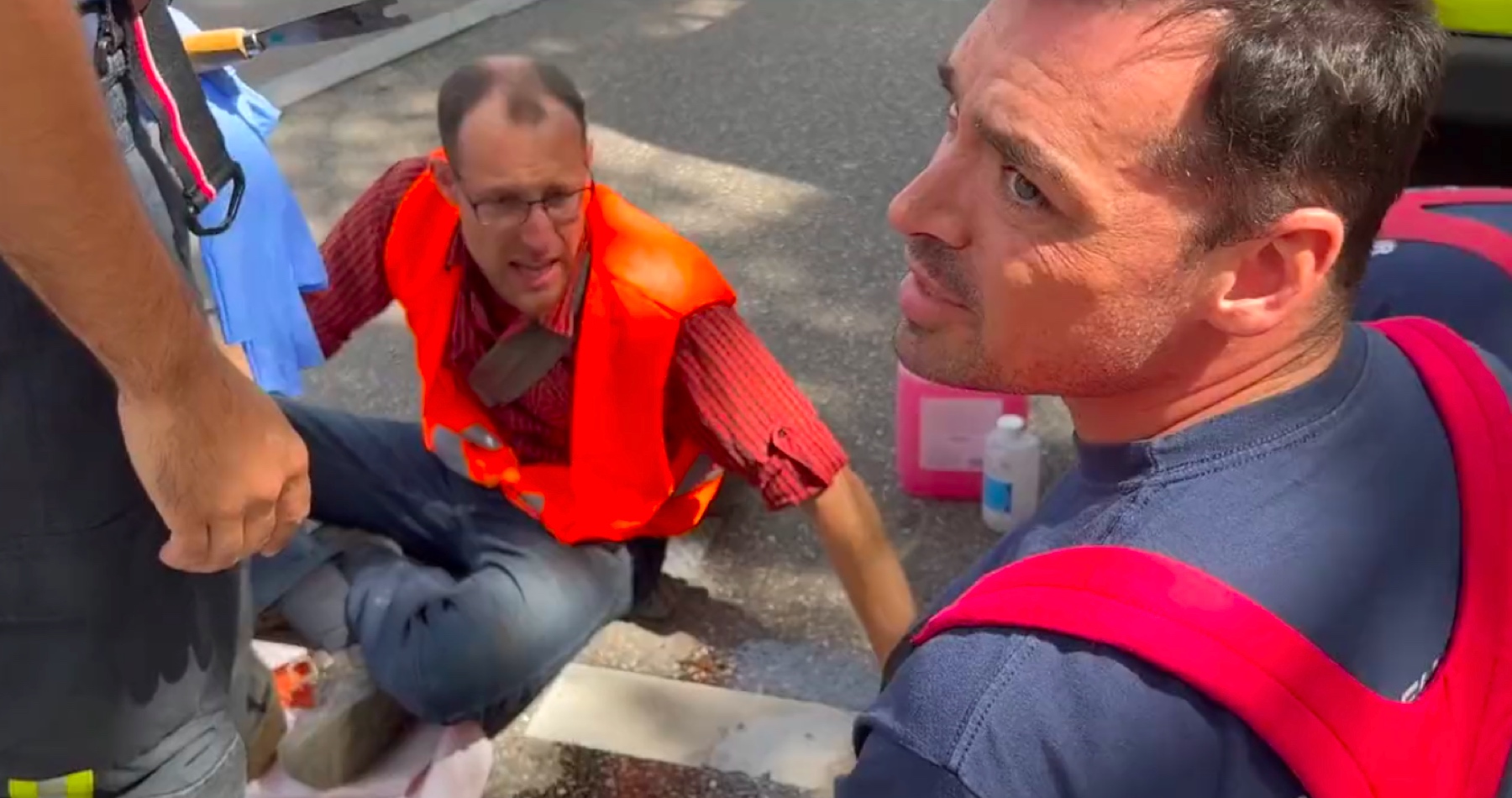 VIDEO: Vřeštící aktivista přilepený k silnici nadával hasičům, kteří ho odřezávali