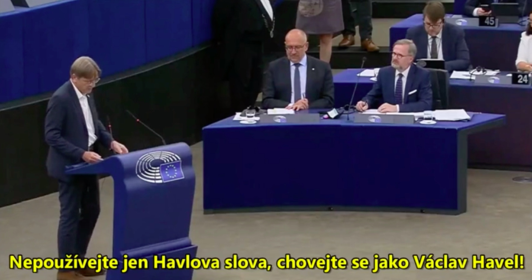 VIDEO: Vy jen mluvíte jako Václav Havel, ale nekonáte jako Václav Havel! Český premiér Petr Fiala dostal seřváno v Evropském parlamentu od evropského vrchního politruka Guye Verhofstadta, že není schopen říct “Ano” na požadavek zrušení práva veta jednotlivých států v Evropské radě!