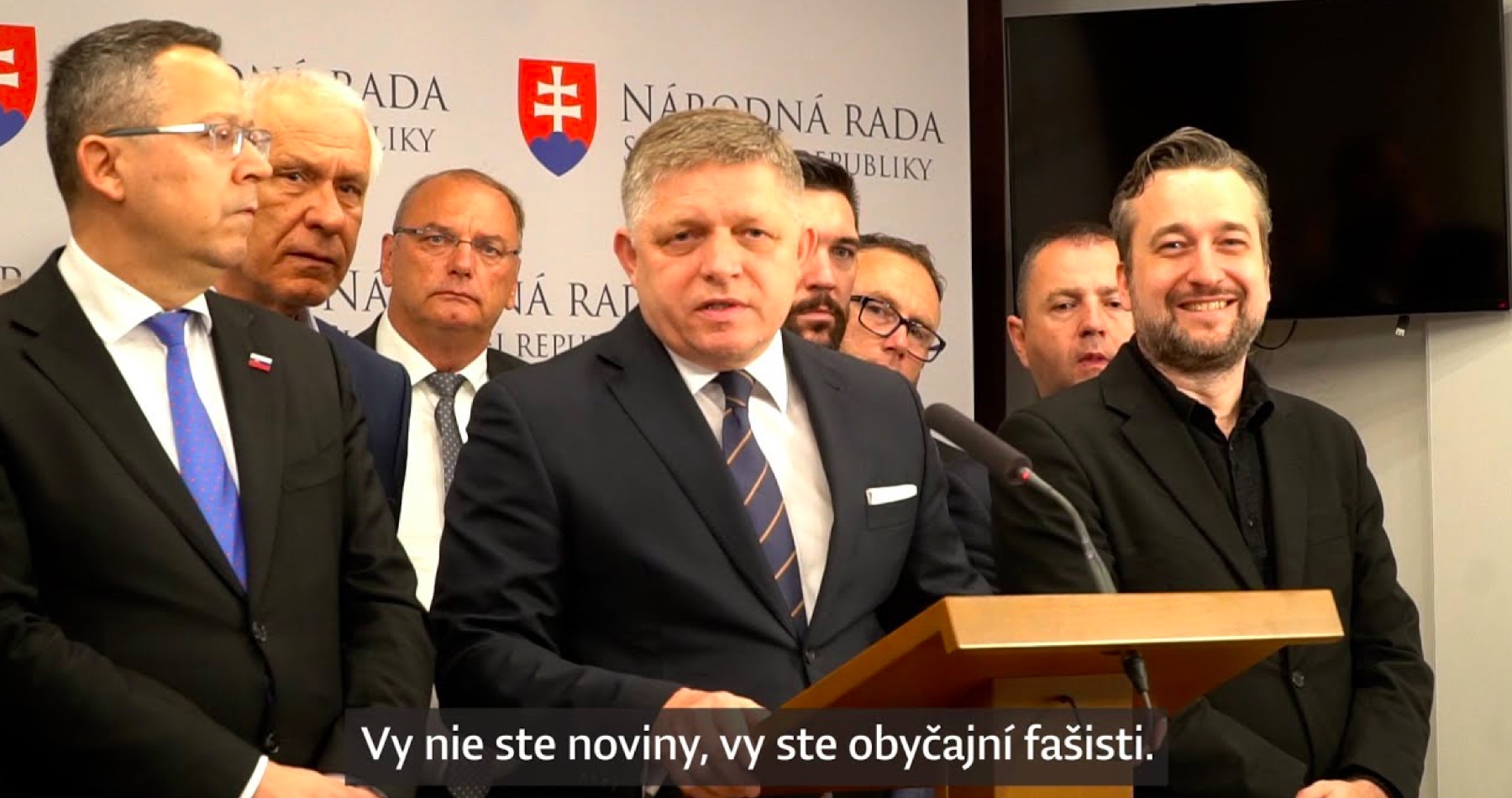 Redaktorka Denníka N vo svojej otázke skonštatovala, že Senát Najvyššieho súdu, ktorý poslal Dušana Kováčika do väzenia na osem rokov, ktorý podľa Roberta Fica porušuje ľudské práva, prepustil Roberta Kaliňáka z väzby. „Vy nie ste noviny, vy ste obyčajní fašisti,“ odpovedal Fico reportérke Denníka N, keď ho na rozpor upozornila.