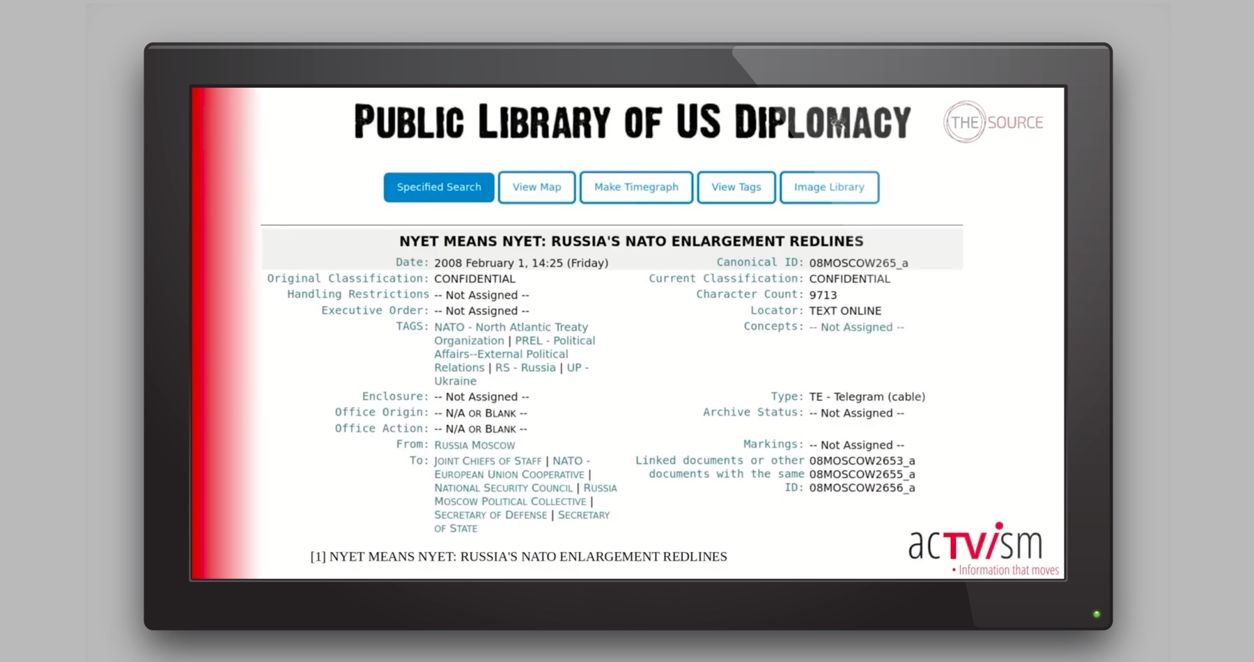 Organizácia tiež citovala telegram z februára 2008 od vtedajšieho veľvyslanca USA v Moskve Williama Burnsa, ktorý varoval, že Rusko považuje rozširovanie NATO za bezpečnostnú hrozbu.