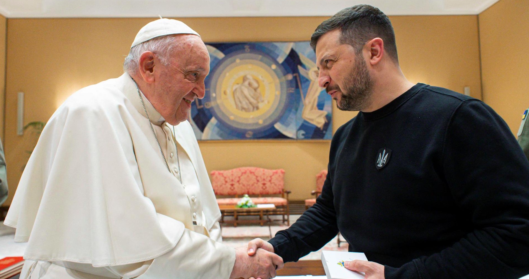 Hlava katolíckej cirkvi venovala svojmu hosťovi malú skulptúru predstavujúcu olivovú ratolesť ako symbol mieru. Zelenskyj zase obdaril pápeža mariánskou ikonou namaľovanou na zvyšku nepriestrelnej vesty.