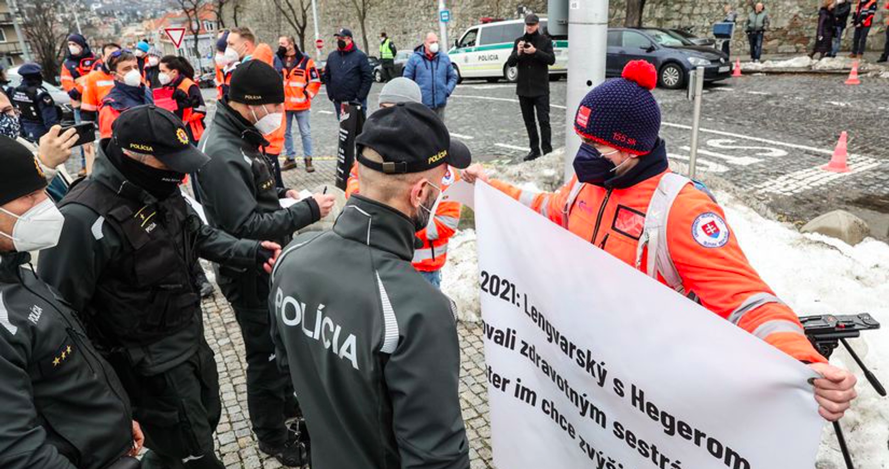 Dvojicu záchranárov, vrátane ich šéfa Františka Majerského, zobrala polícia včera popoludní spred budovy parlamentu, kde sa zišli záchranári a sestry, aby vláde a poslancom pripomenuli svoje postavenie aj sľuby o zvýšení platov. Stalo sa tak v deň, keď parlament hlasoval o budúcoročnom štátnom rozpočte, ktorý rátal o zvýšení ich platov o 36 eur v hrubom či reforme nemocníc.